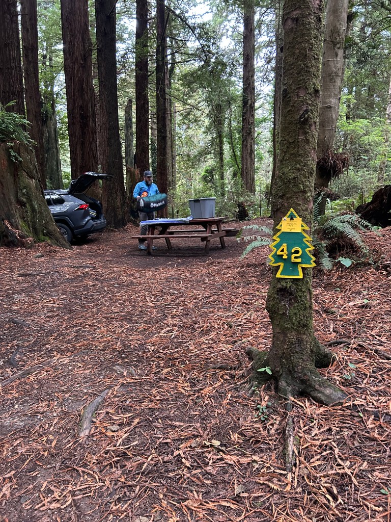 We arrived in Trinidad around 4pm the day of check-in. We got to our site, which we had selected online just based on a property map, and realized it was closer to the road, more exposed, and just less flat than we would have liked. The benefit of it being October and these being tent sites is that practically all of the sites around us were unoccupied. We walked through them and selected our favorite then went back to front desk to confirm it was okay for us to move – they updated our parking & site tags with the new site number and we proceeded to set up camp. Or, rather, Kendall proceeded to set up camp. I helped a little when it was just easier to have 4 hands rather than 2, but he did most of it.