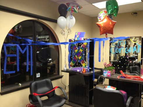 Last week I graduated from beauty school. My girls at school did it up big with the decorating and the balloon-getting and the flower-giving, as evidenced below.